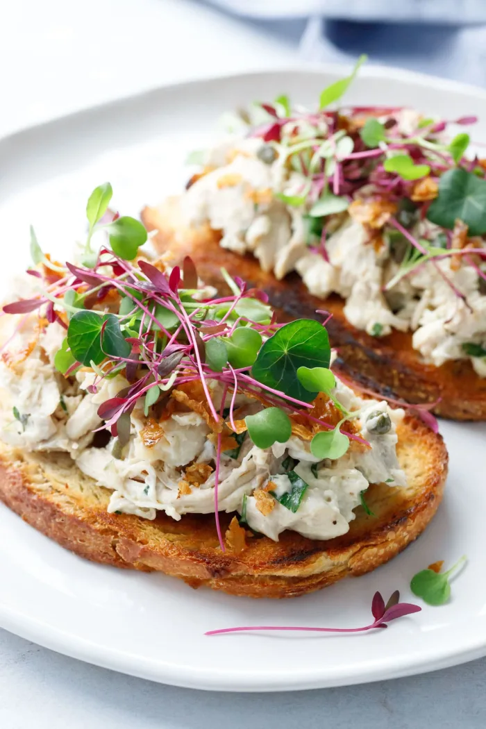 Creamy, flavorful chicken salad made with shredded rotisserie chicken and served atop grilled sourdough toasts with crispy chicken skin and microgreens.