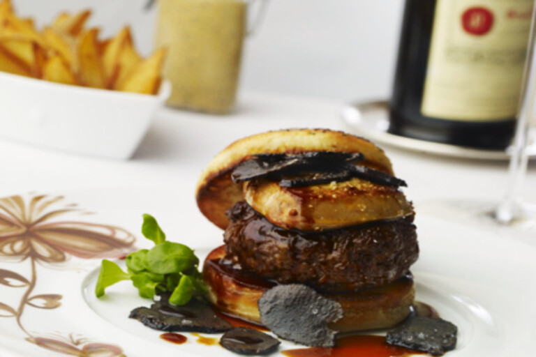 Found at Fleur by Hubert Keller in Las Vegas, this luxurious burger is made with Wagyu beef, foie gras, and truffle and served with a bottle of Chateau Petrus wine.