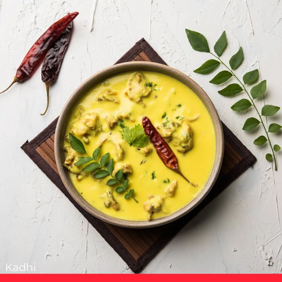 Kadhi or karhi is a dish originating from Rajasthan. It consists of a thick gravy based on gram flour, and contains vegetable fritters called pakoras, to which dahi (yogurt) is added to give it a bit of sour taste. It is often eaten with cooked rice or roti.