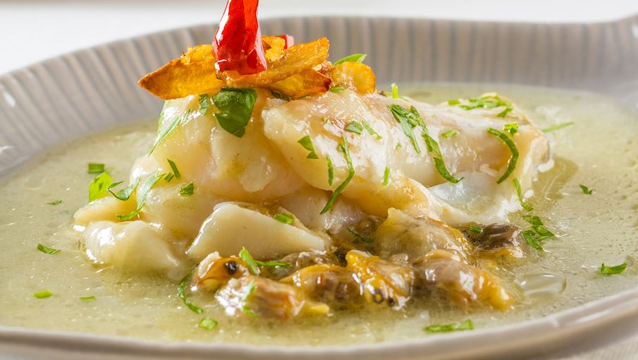 Gelatinous fish heads known as kokotxas are a key ingredient for this classic Basque dish. Kokotxas usually come from the flashy cheeks (lower part of chin) of hake or cod. The dish is sometimes served in a sauce consisting of white wine, garlic, flour, and olive oil.