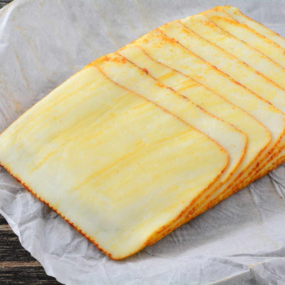 Muenster is most recognizable by its orange exterior that comes from a vegetable coloring added during the cheesemaking process. The flavor is mild and creamy and the texture is soft. Try it melted on a burger or in mac and cheese.
