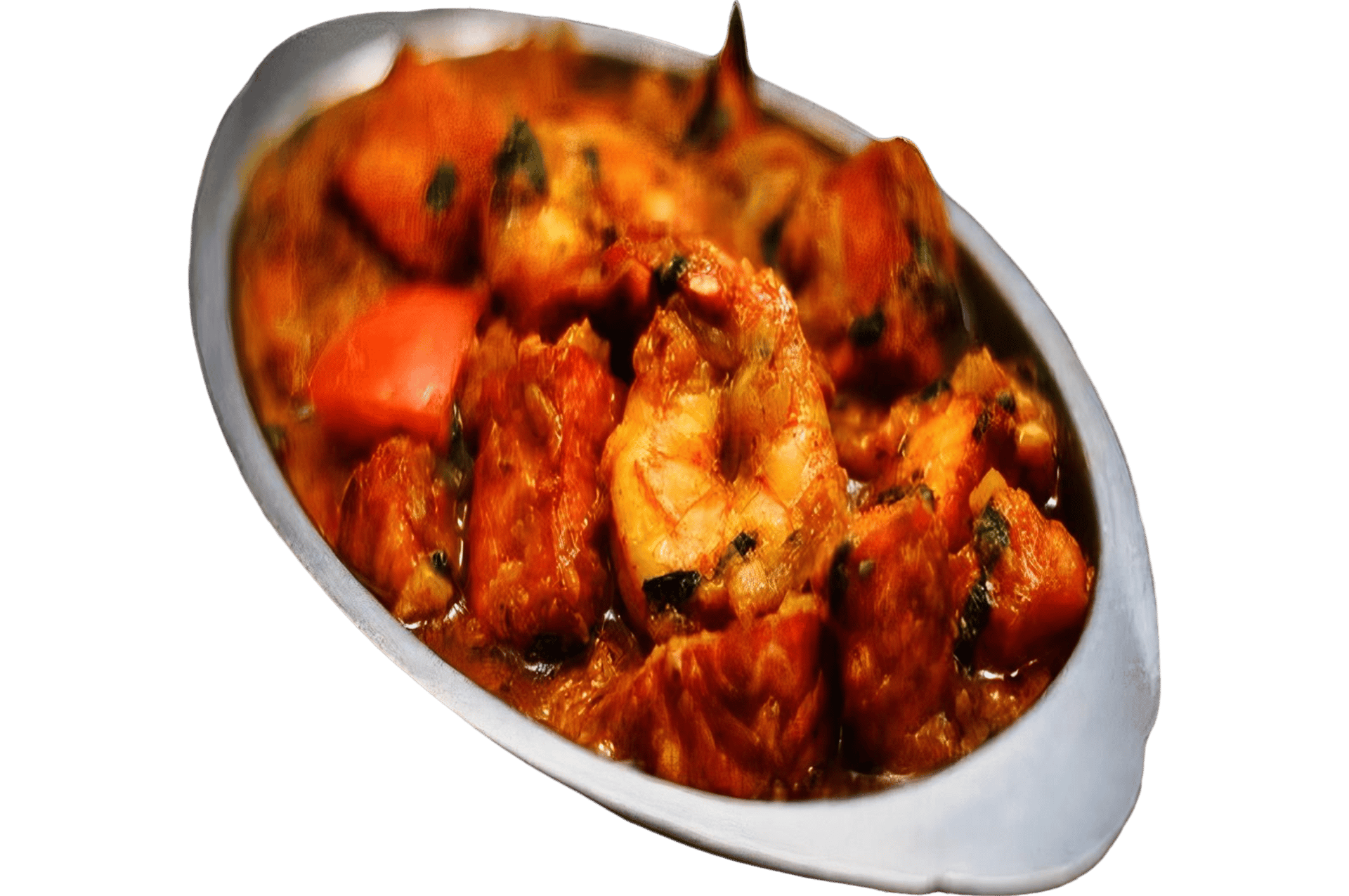 Shrimp & salmon, onions, bell pepper & tomato in karahi sauce.
